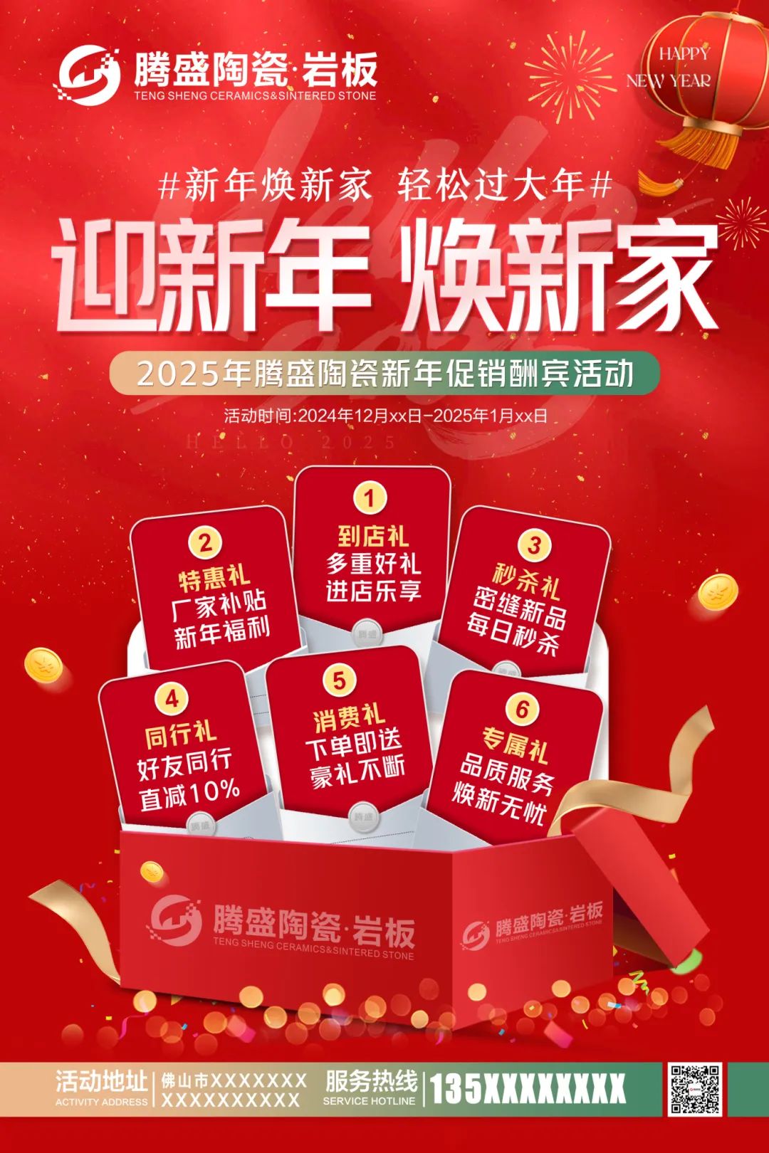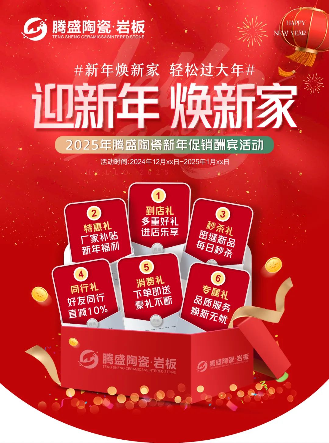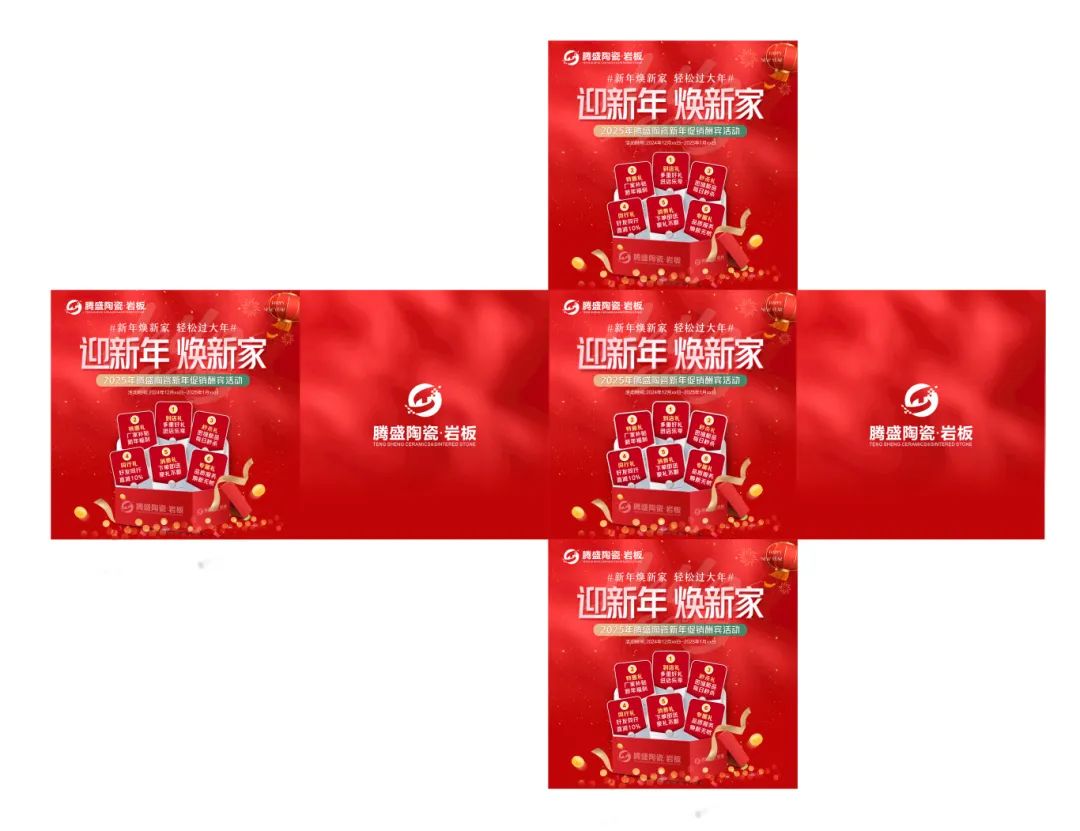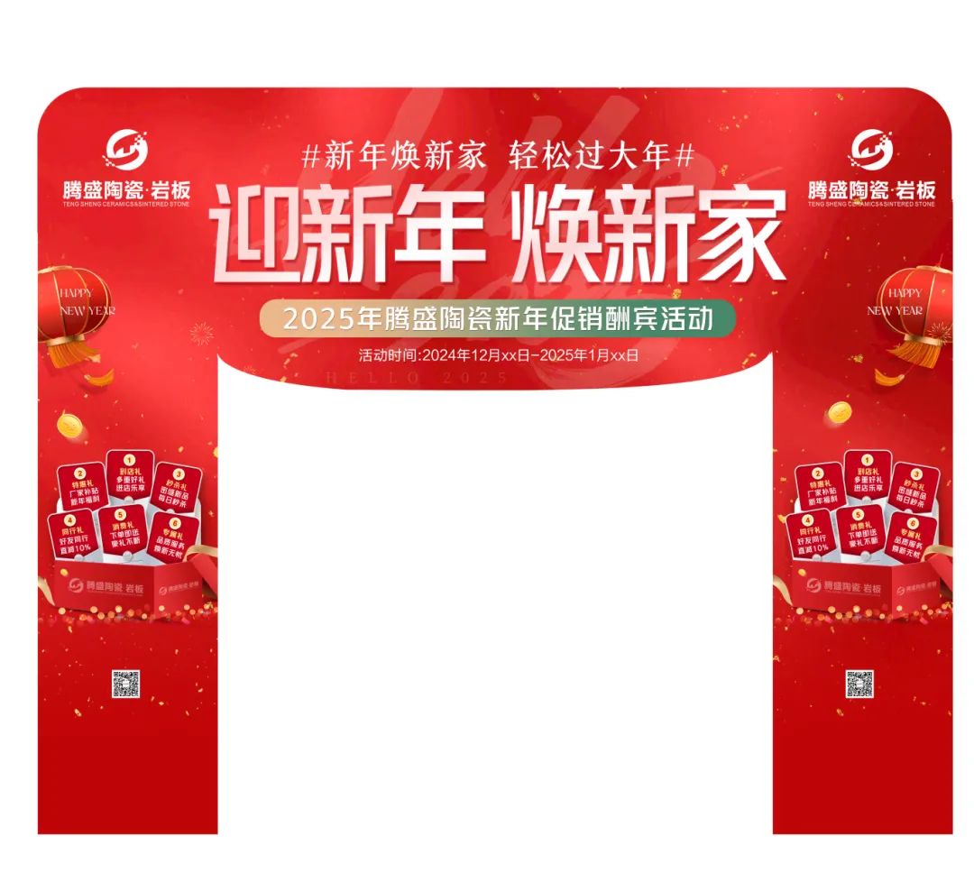 致经销商们:Happy New Year为了迎接新年元旦销售节点,更好地配合广大经销商开展促销活动,营造浓郁的促销氛围,抢占市场,腾盛陶瓷发起“迎新年,焕新家”促销活动,并推出系列促销方案及物料,含拱门、单张、展架、贴纸等整套源文件。